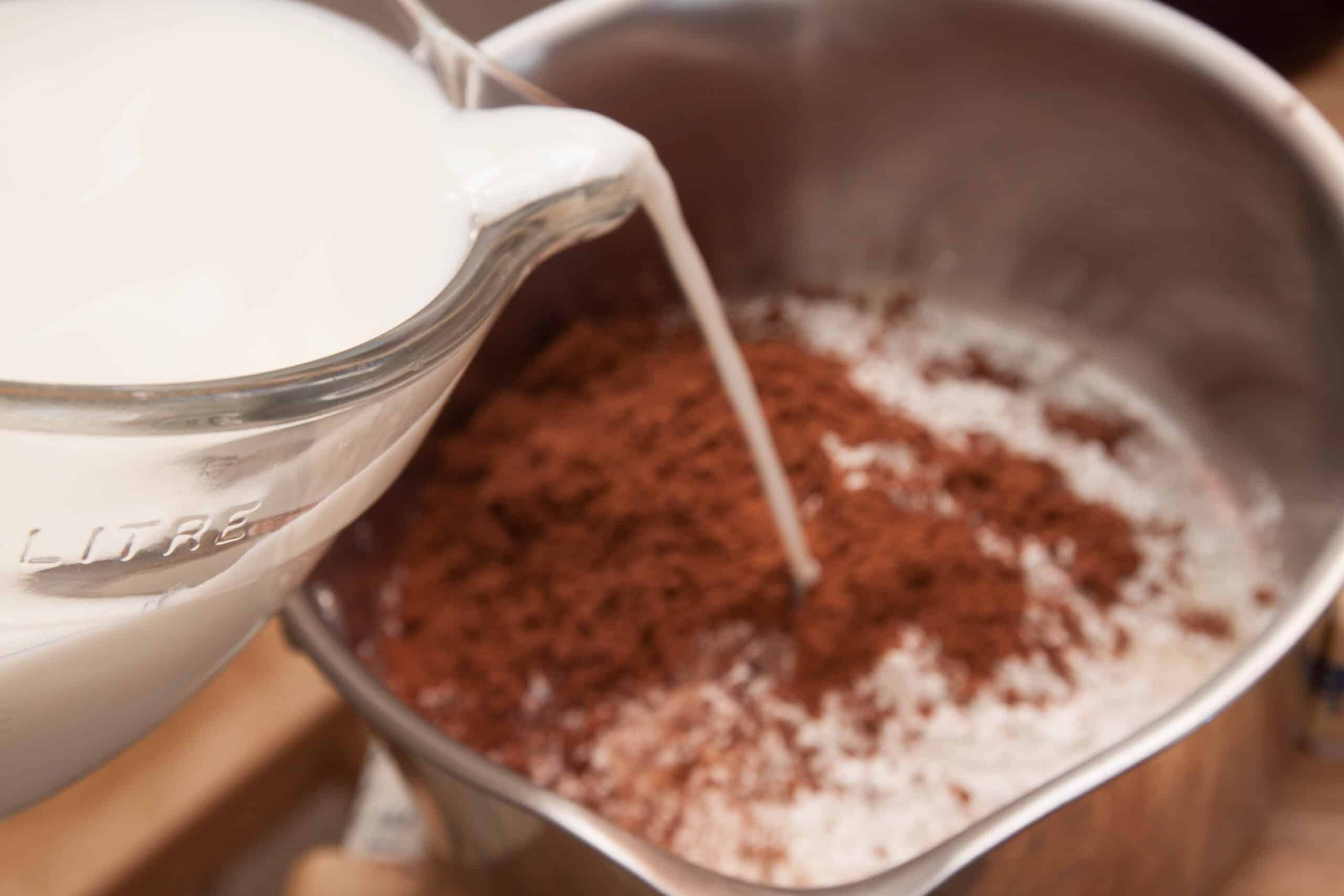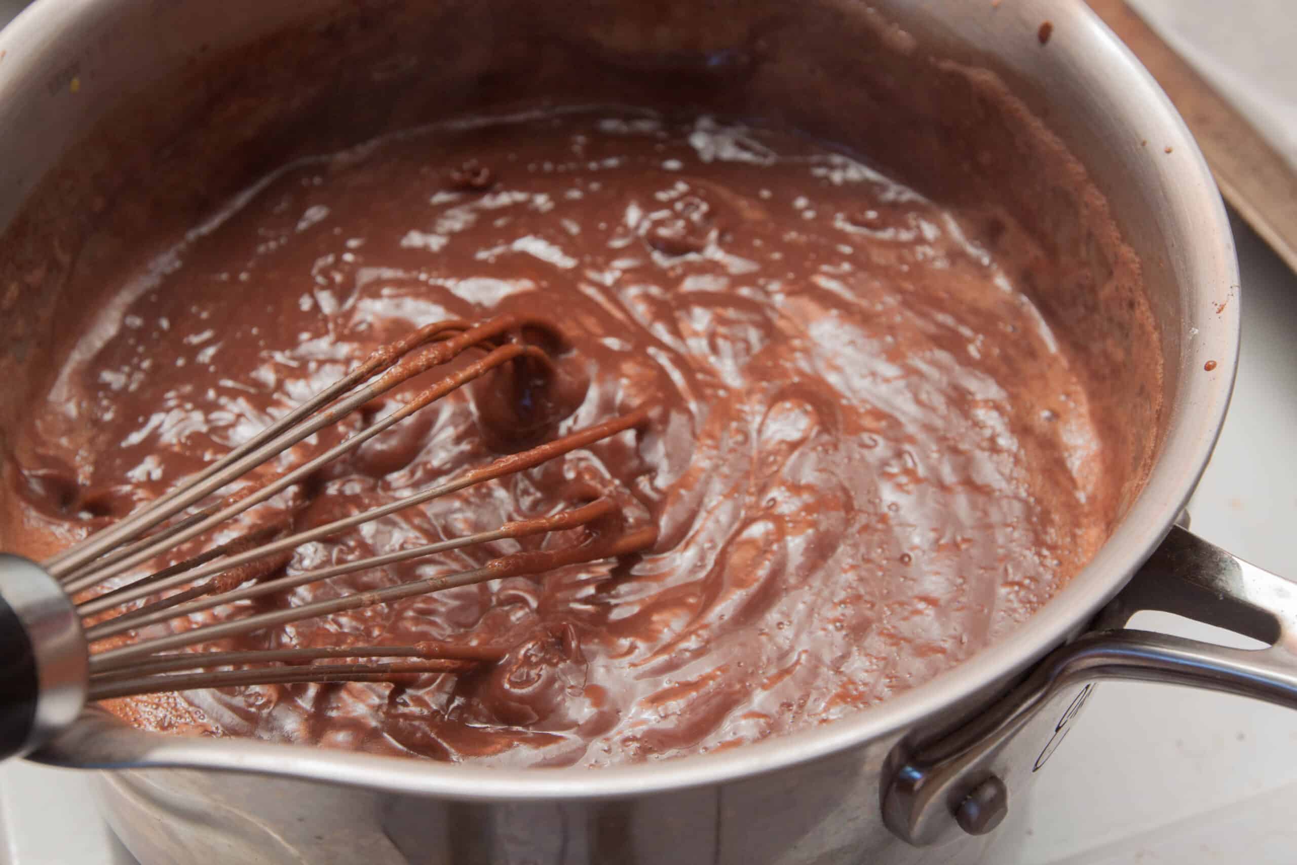 Next, in my saucepan off the oven, I mixed the sugar, cornstarch, cacao powder, and a pinch of salt. Then, very very slowly, I added the milk. Just a little bit at a time so that everything dissolved together well.