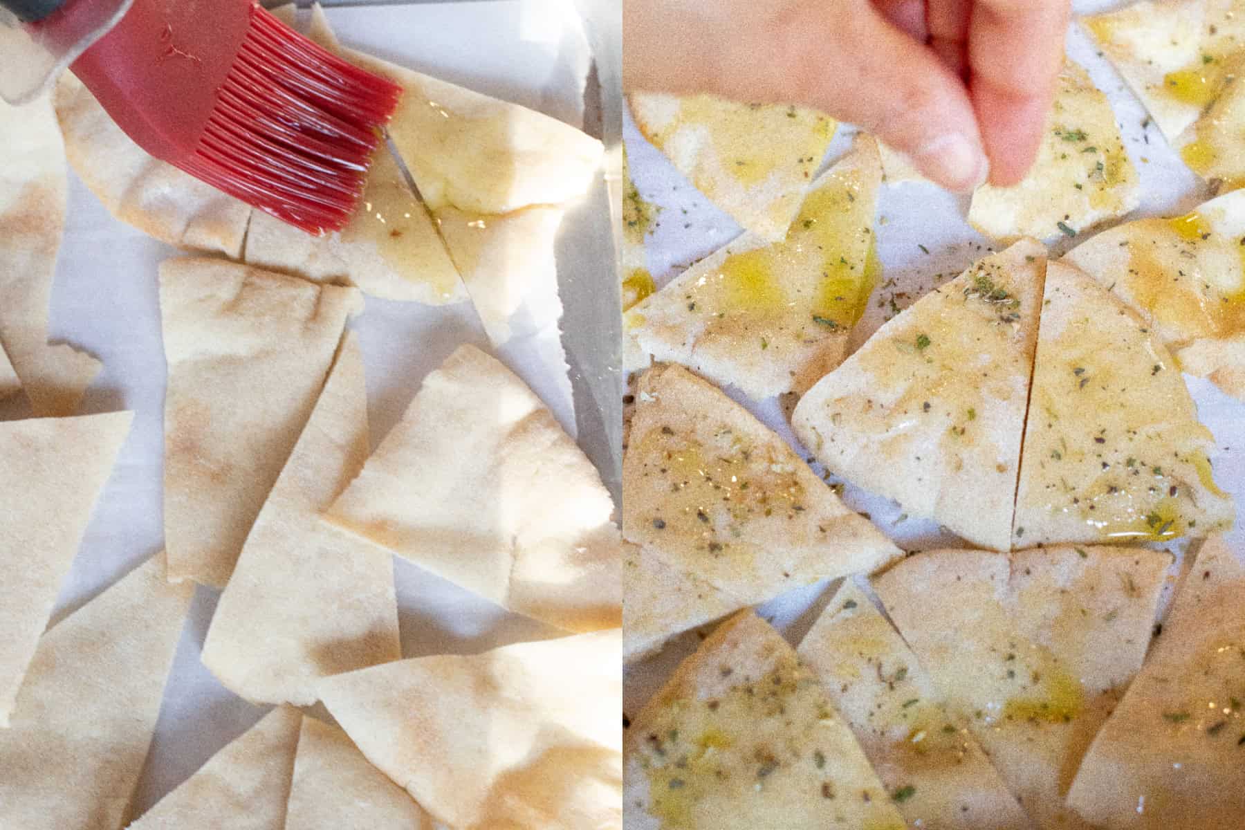 - Season Pita Triangles: Line the baking sheet with pita triangles in one layer. Brush with olive oil and then sprinkle with Italian seasoning and salt.